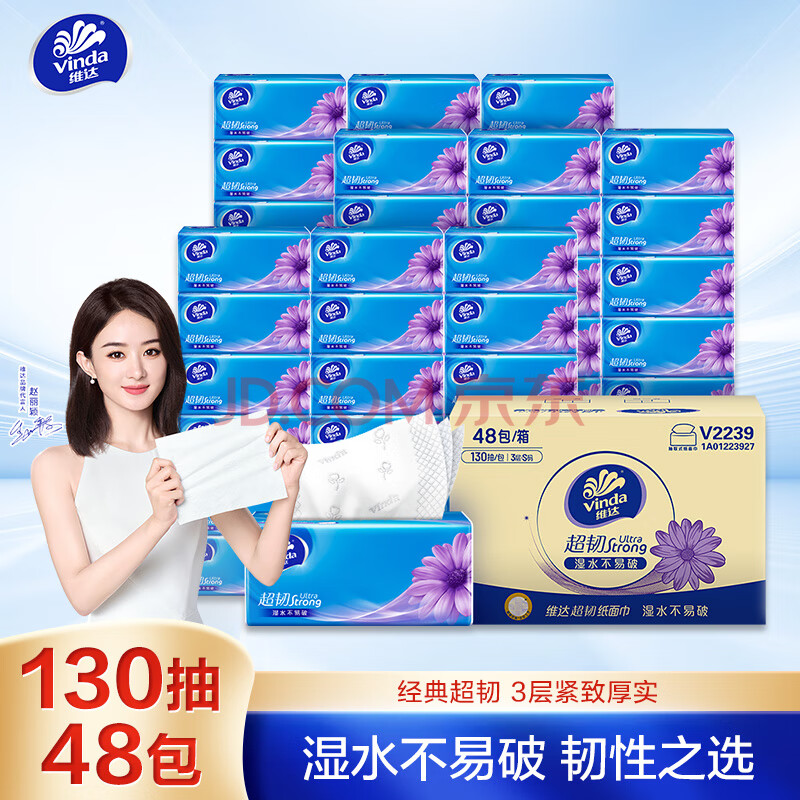 维达(Vinda)抽纸 超韧3层130抽*48包S码 湿水不易破 餐巾纸 纸巾卫生纸 整箱¥139.9 已售:0